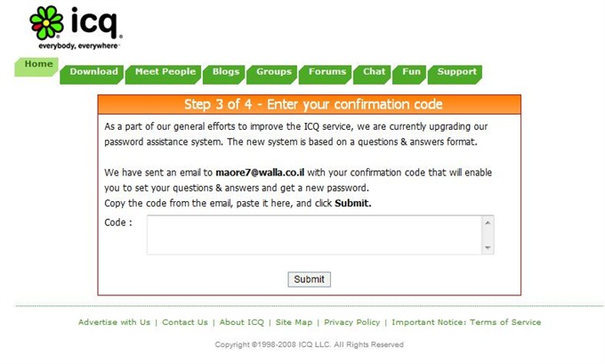 תבדוק בדואר נכנס או בתקיית ספאם אם קיבלת הודעה מהאתר ICQ