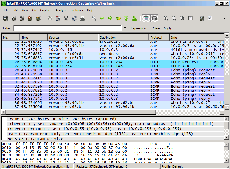 Wireshark זהו Sniffer מעולה שיאפשר לכם לרחרח סביב תעבורת הרשת שלכם. הוא מאפשר מעבר נוח בין פאקטים וצפייה ב deep level של ה packets.
