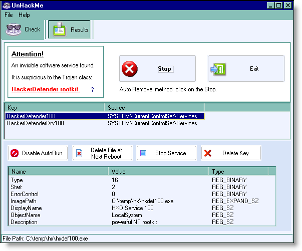 לאחרונה בפורוםהתוכנה UnHackMe נועדה להסרת וירוסים ו Rootkits. התוכנה מוצלחת ביותר ופותרת 80% מבעיות הוירוסים במחשב. השימוש בתוכנה יעשה לאחר שהמחשב כבר נגוע בוירוס. כדאי לקרוא על התוכנה באתר שלנו לפני השימוש בתוכנה. אמנם היא יעילה מאוד, אך הרסנית מאוד- במידה ואינכם מתמצאים בתיפעולה.