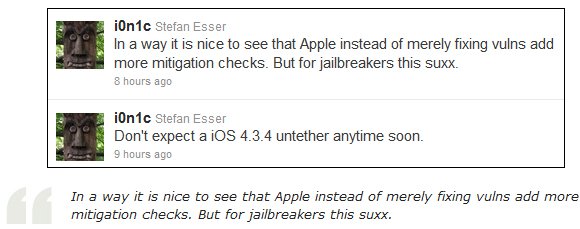 לאחרונה בפורוםלדברי i0n1c, חבר ידוע של הקהילה Jailbreaking iOS, משתמשי אפל לא צריכים לצפות ל- Jailbreak (פריצה לא קשורה) עבור גרסת 4.3.4 בקרוב.